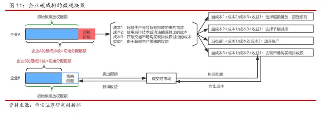 按照華寶證券的分析,有效碳市場的碳排放權(quán)的價格就是企業(yè)的邊際減排成本。在企業(yè)微觀決策上,主要是將碳減排成本、超額碳排放成本、購買碳配額的成本與超額排放生產(chǎn)帶來的收益進(jìn)行比較,并作出相應(yīng)決策。